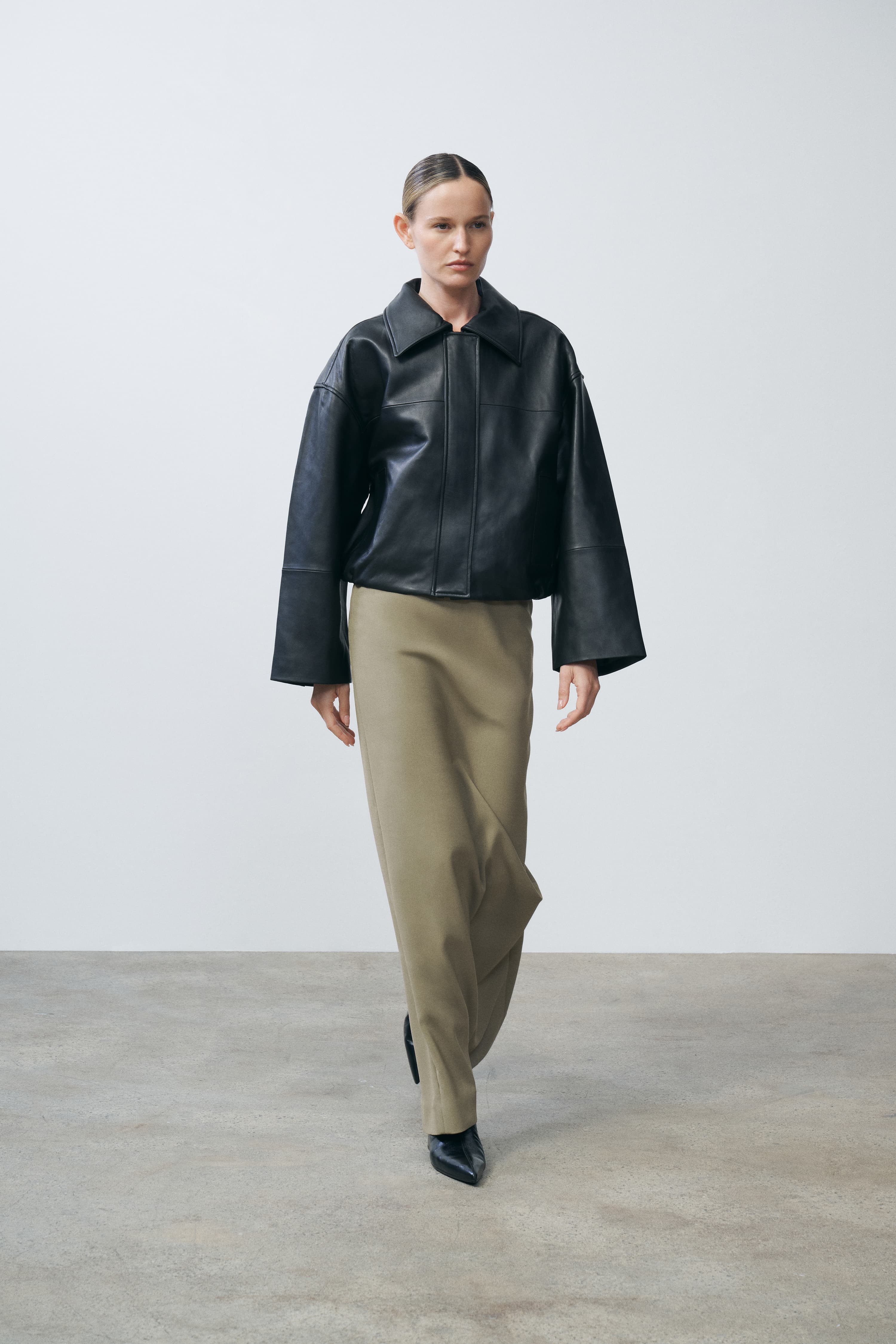 An leather bomber jacket with a structured collar, dropped shoulders, and a cropped, rounded shape. Finished with a concealed front closure and vented back detail.