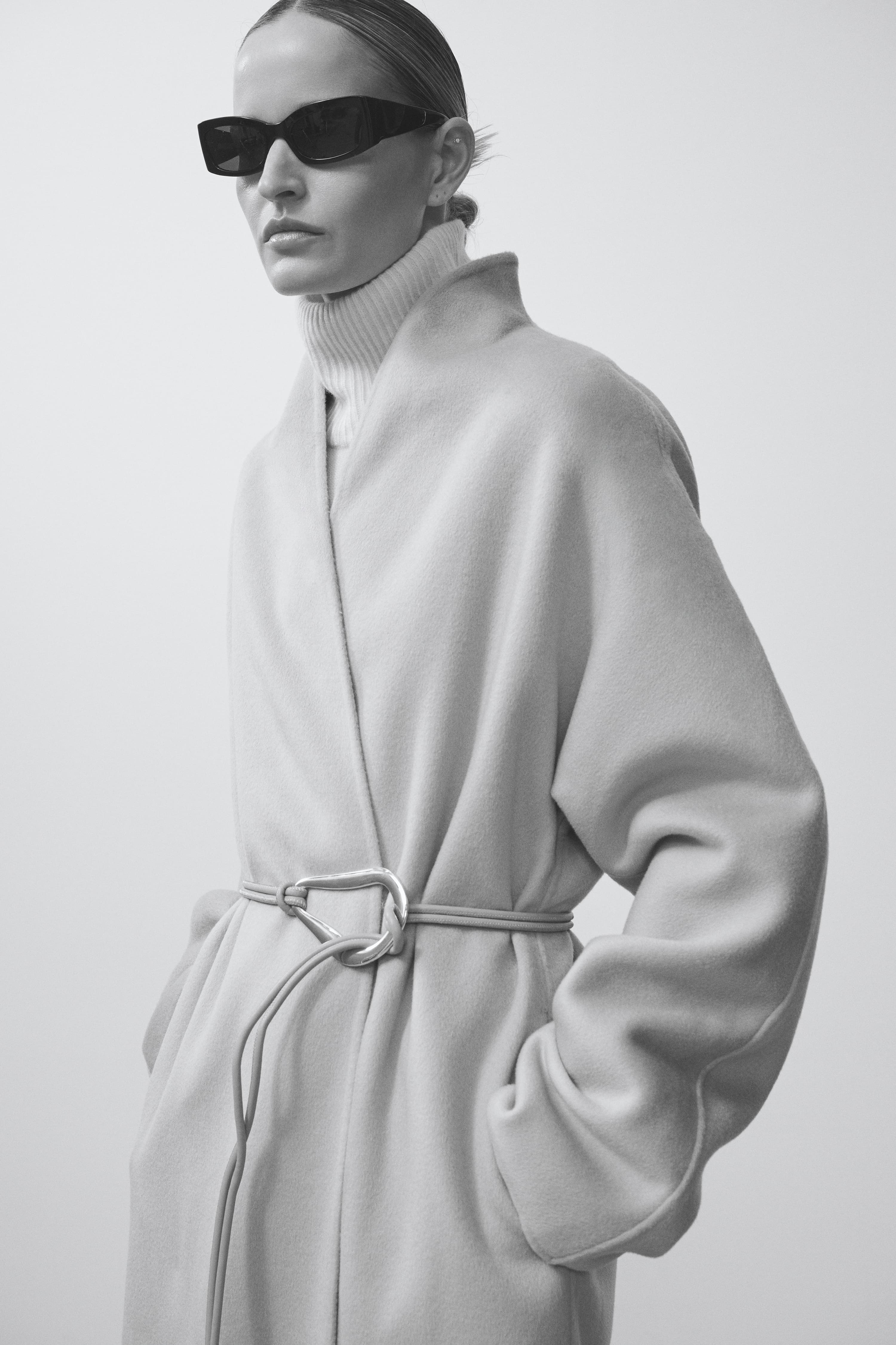 A minimal wool coat with a soft, fluid silhouette. Finished with a sculptural gold buckle belt that cinches the waist for a clean, modern shape.