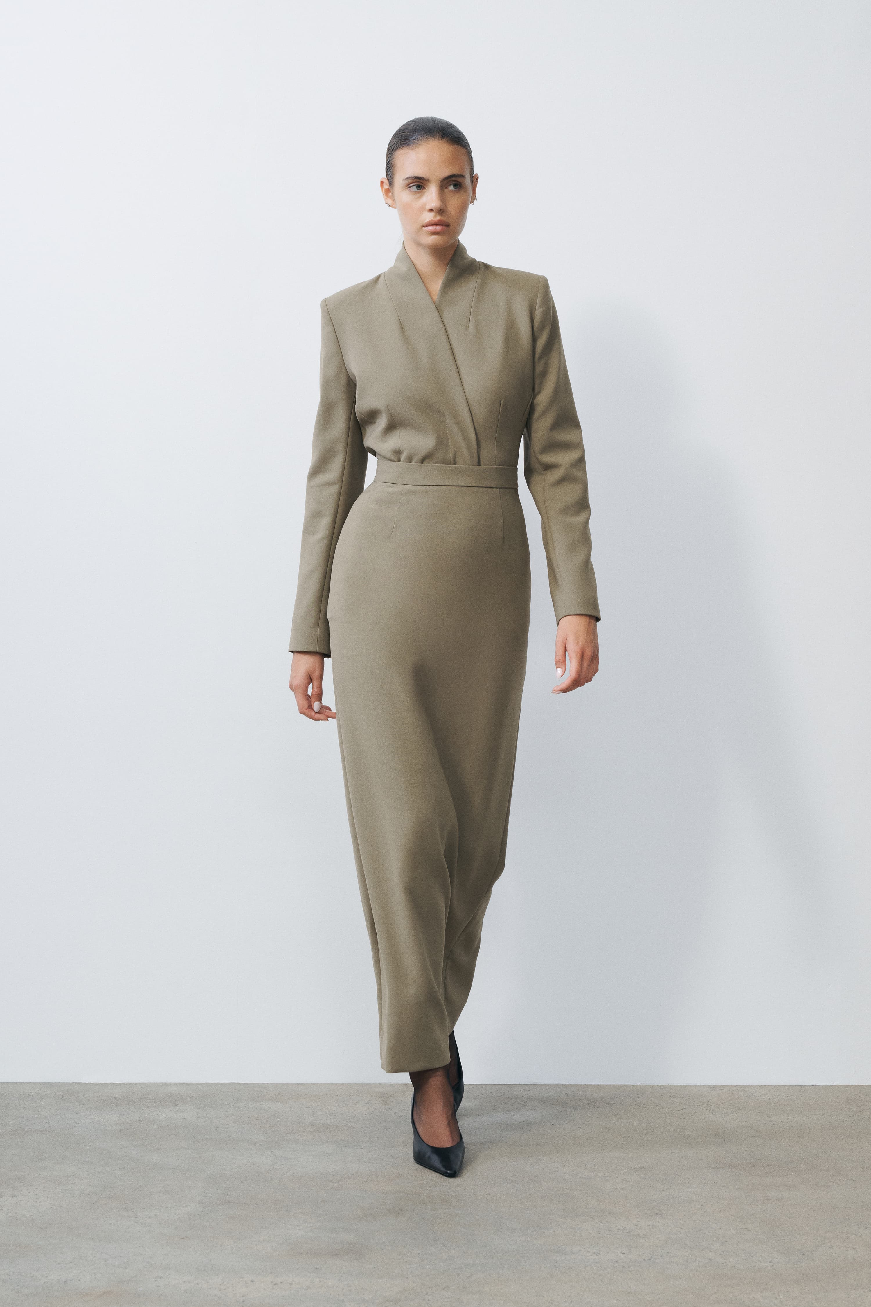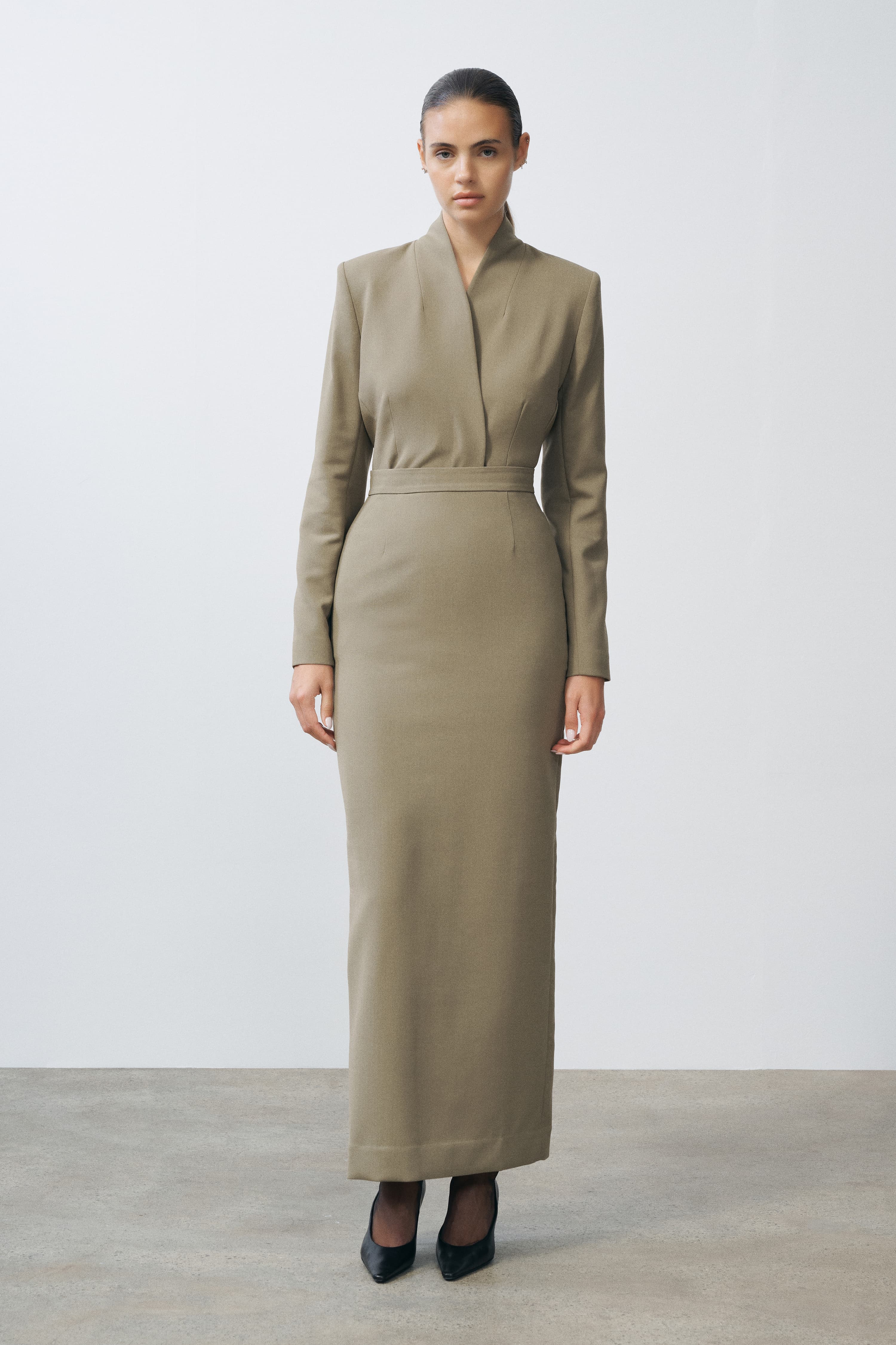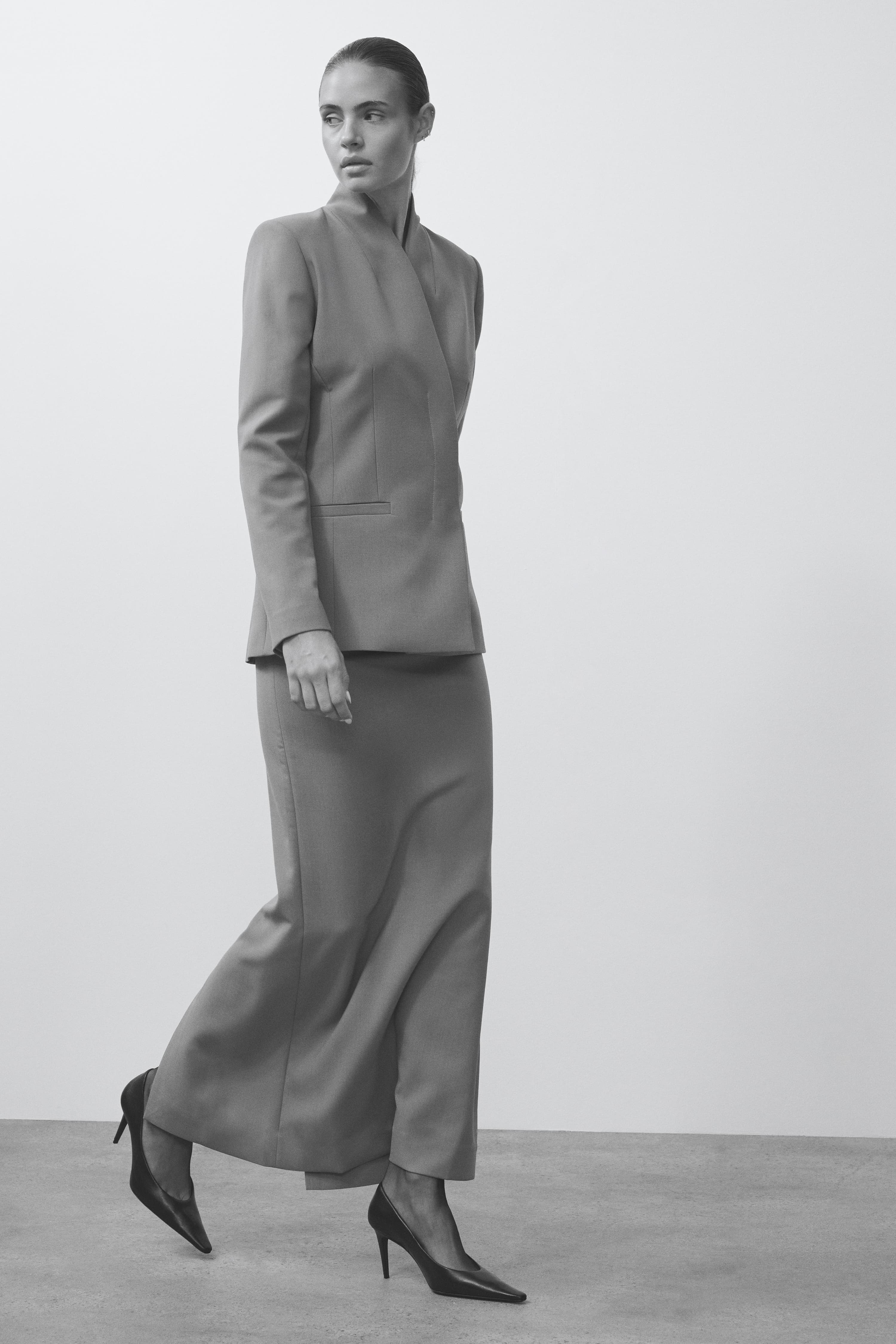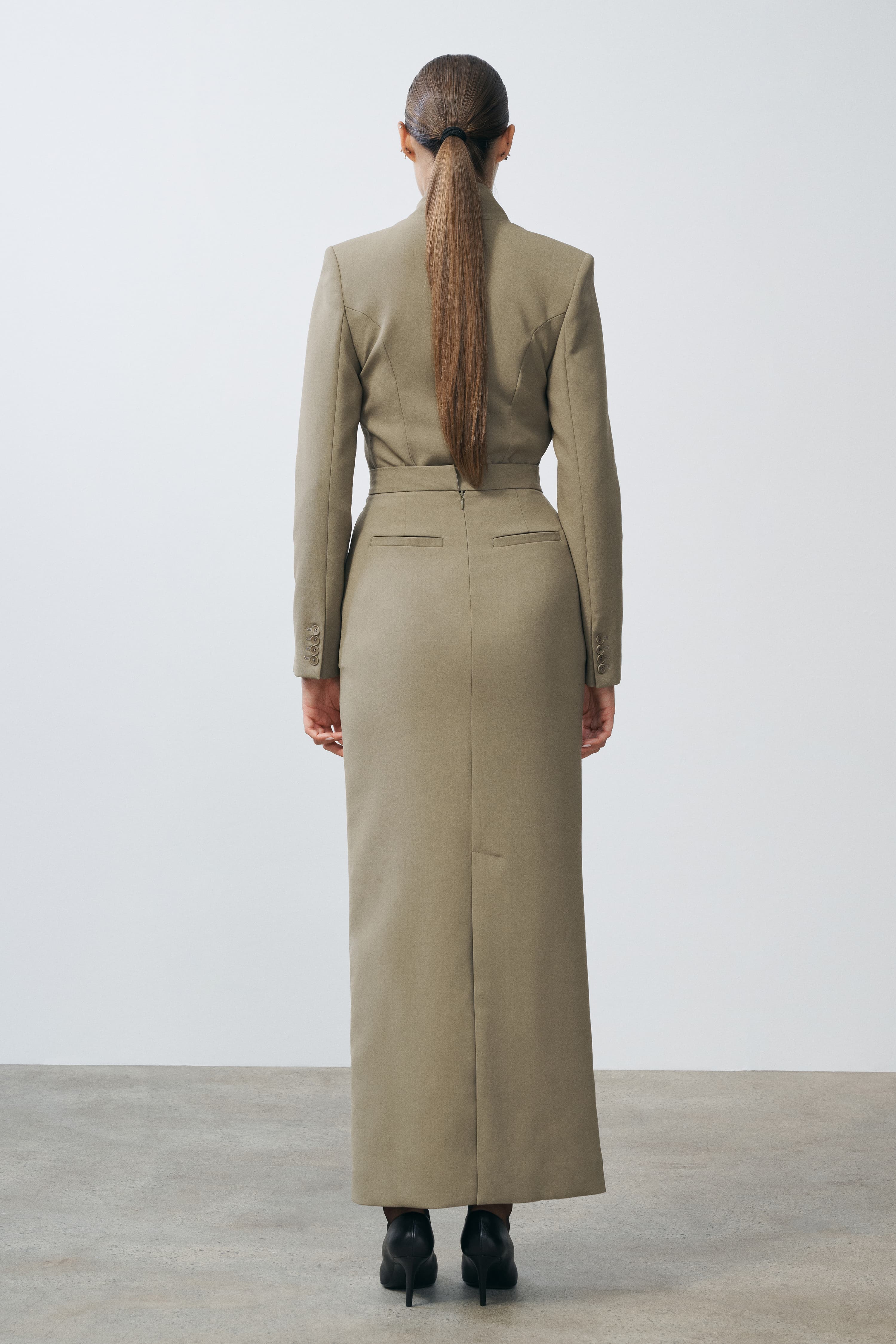 A tailored column skirt with a high waist and slim, elongating fit. Cut from a sleek suiting fabric, it features a back vent for ease of movement and welt pocket detailing for a polished finish.