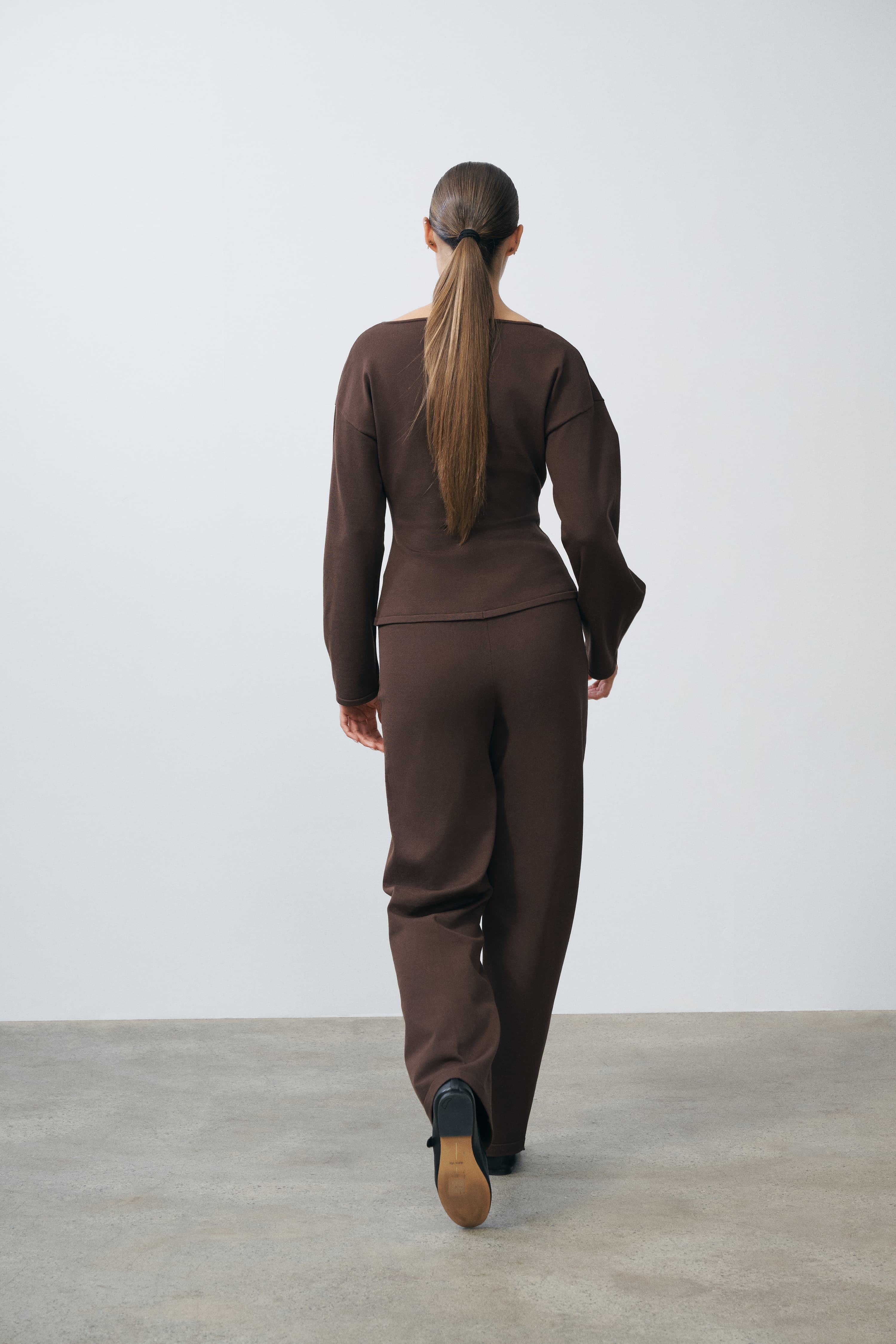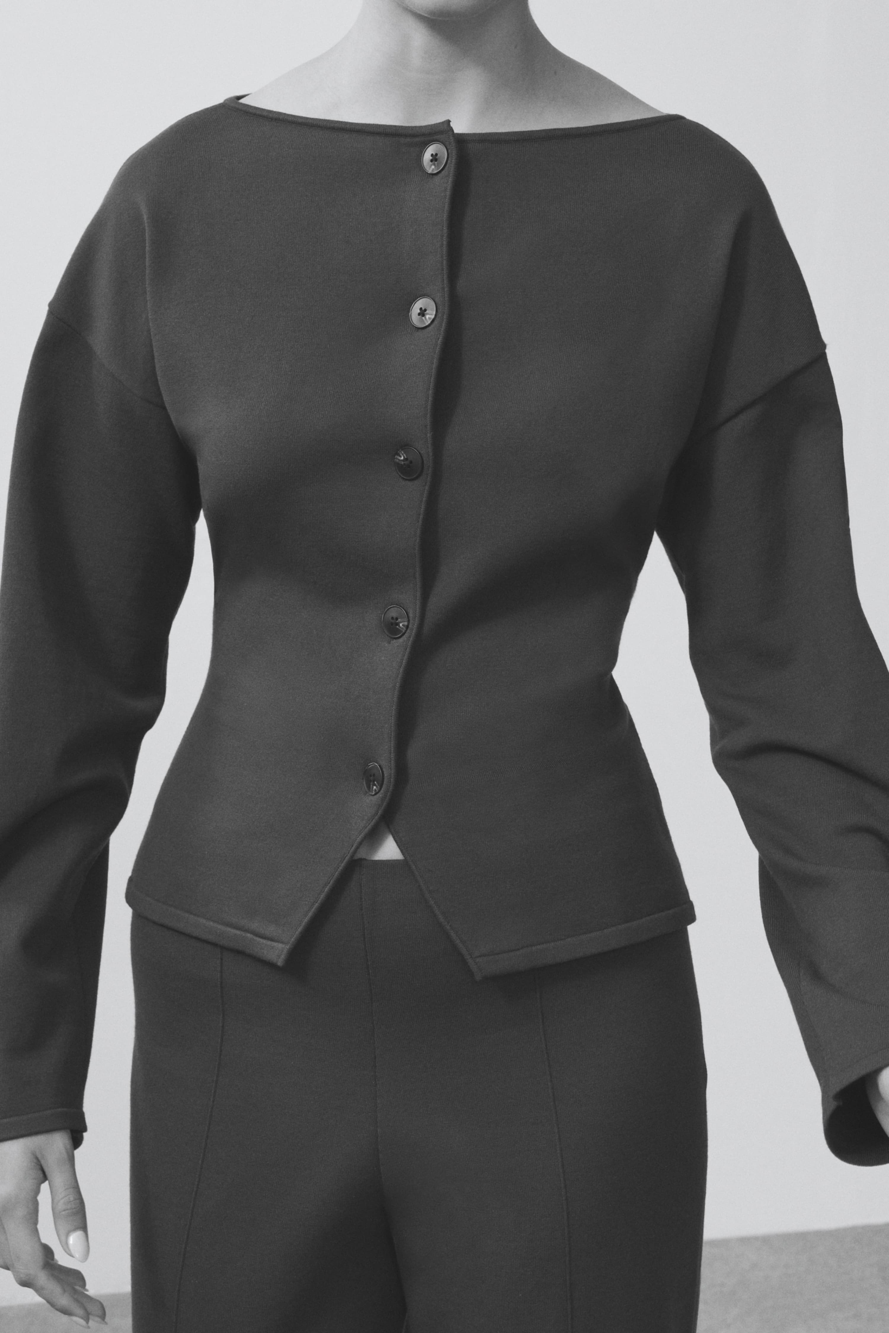 A structured knit cardigan featuring a soft boat neckline, sculpted waist, and slightly flared hem for a clean, architectural silhouette