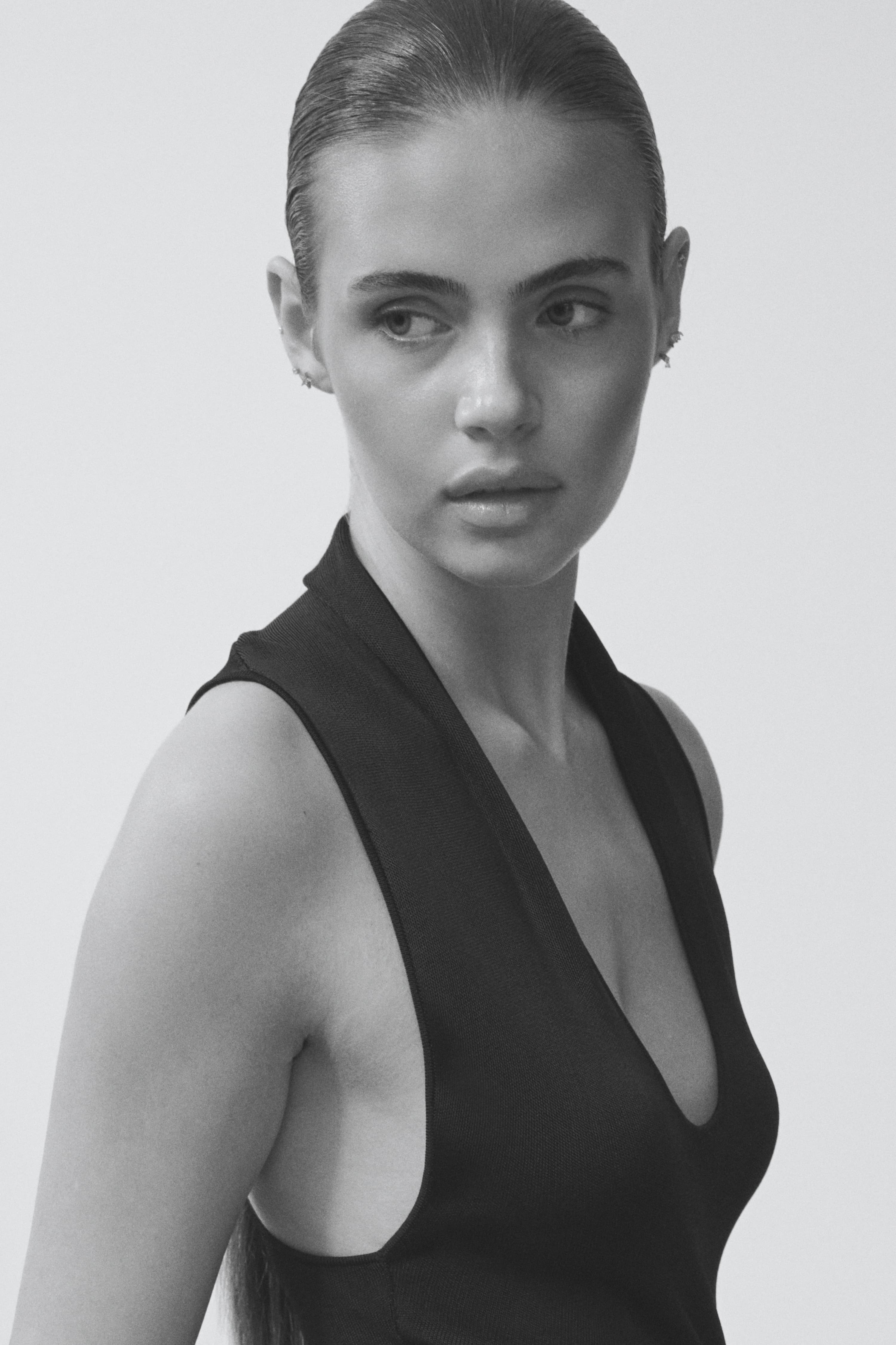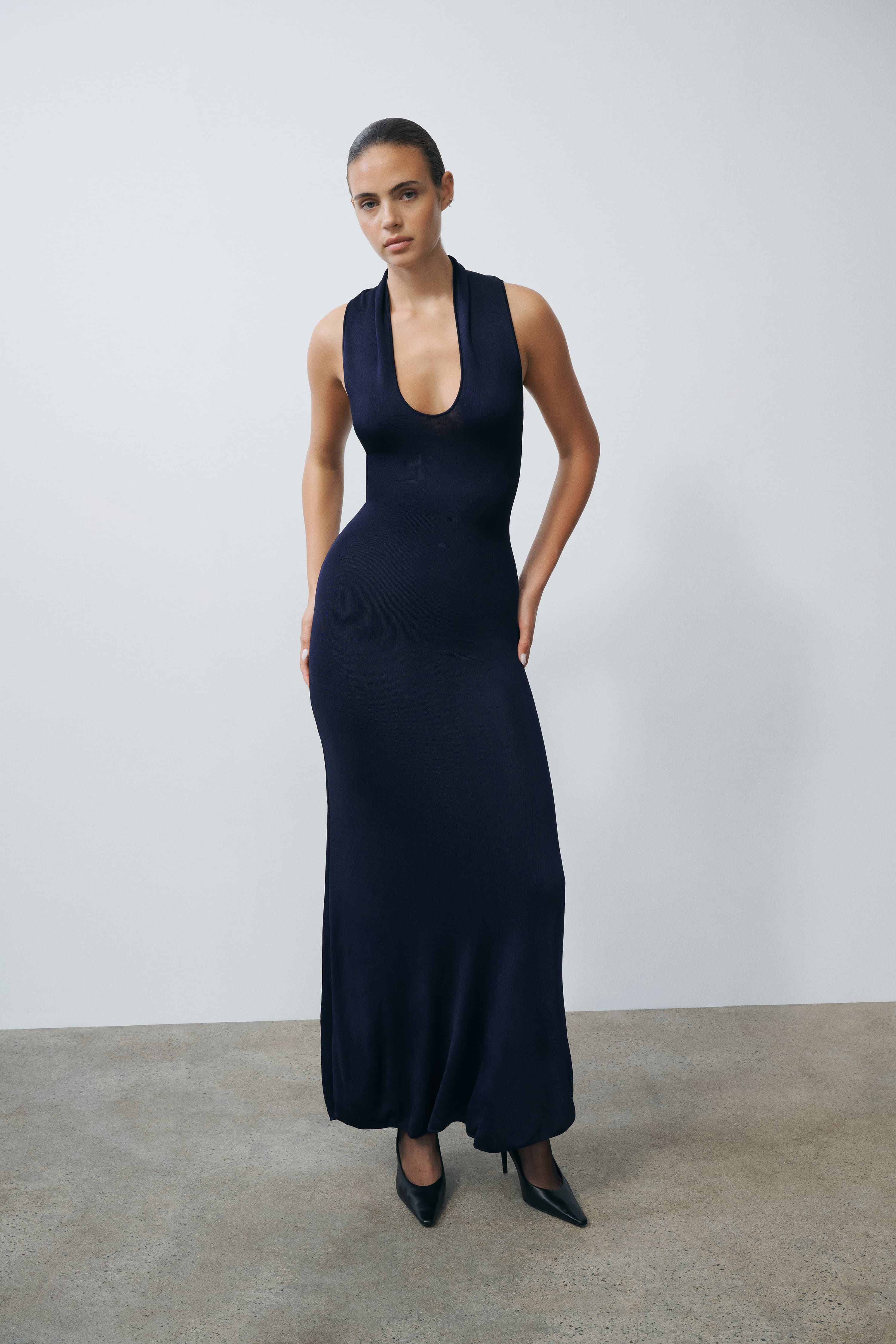 A full-length knit dress crafted with a deep scoop neckline and a sculpted racerback. The body-hugging silhouette contours the figure while maintaining an effortless drape. Minimal and refined, it transitions seamlessly from day to evening with understated elegance.
