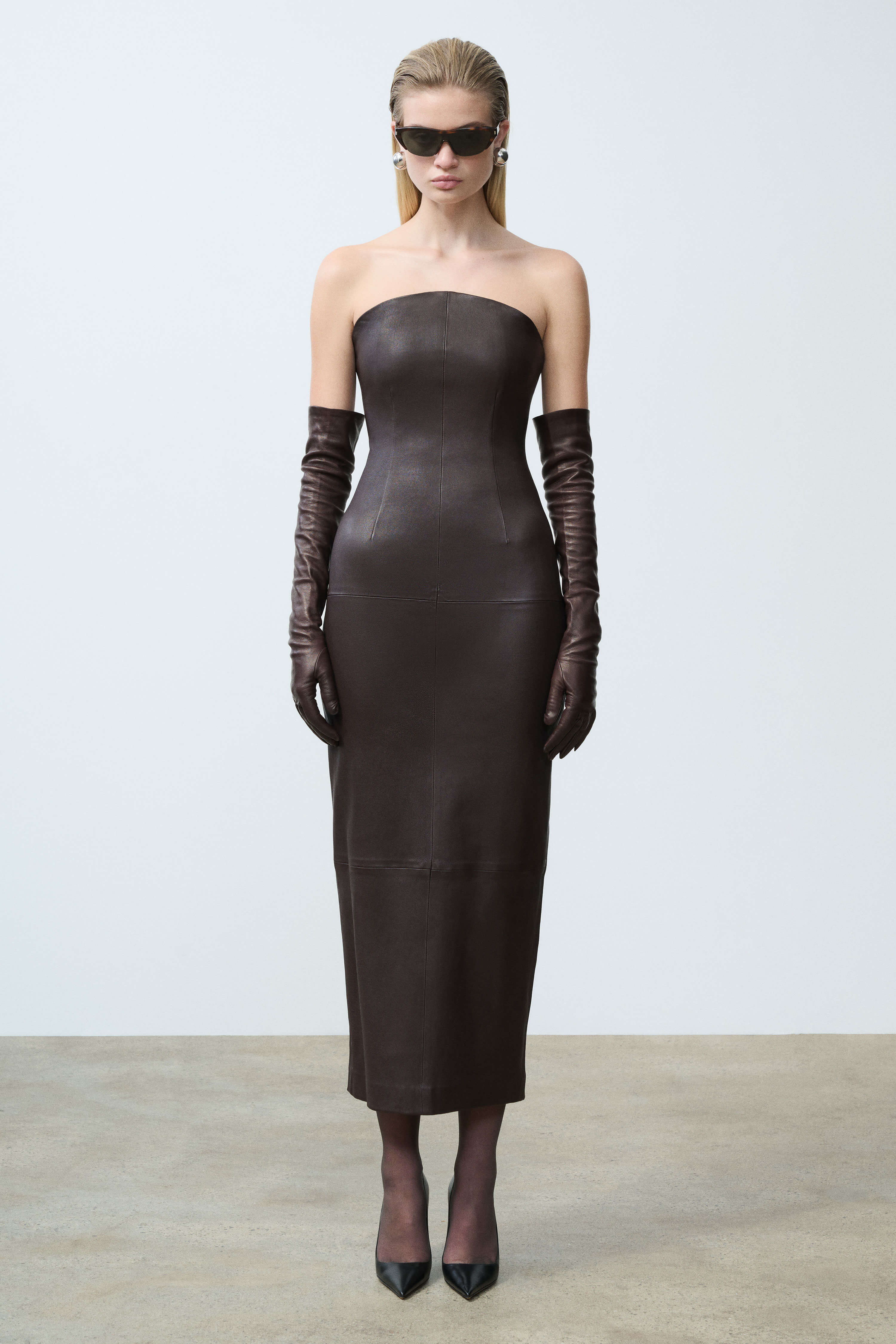 Curved neckline strapless dress in genuine stretch leather, fitted body, ankle length, interior corset construction with boning