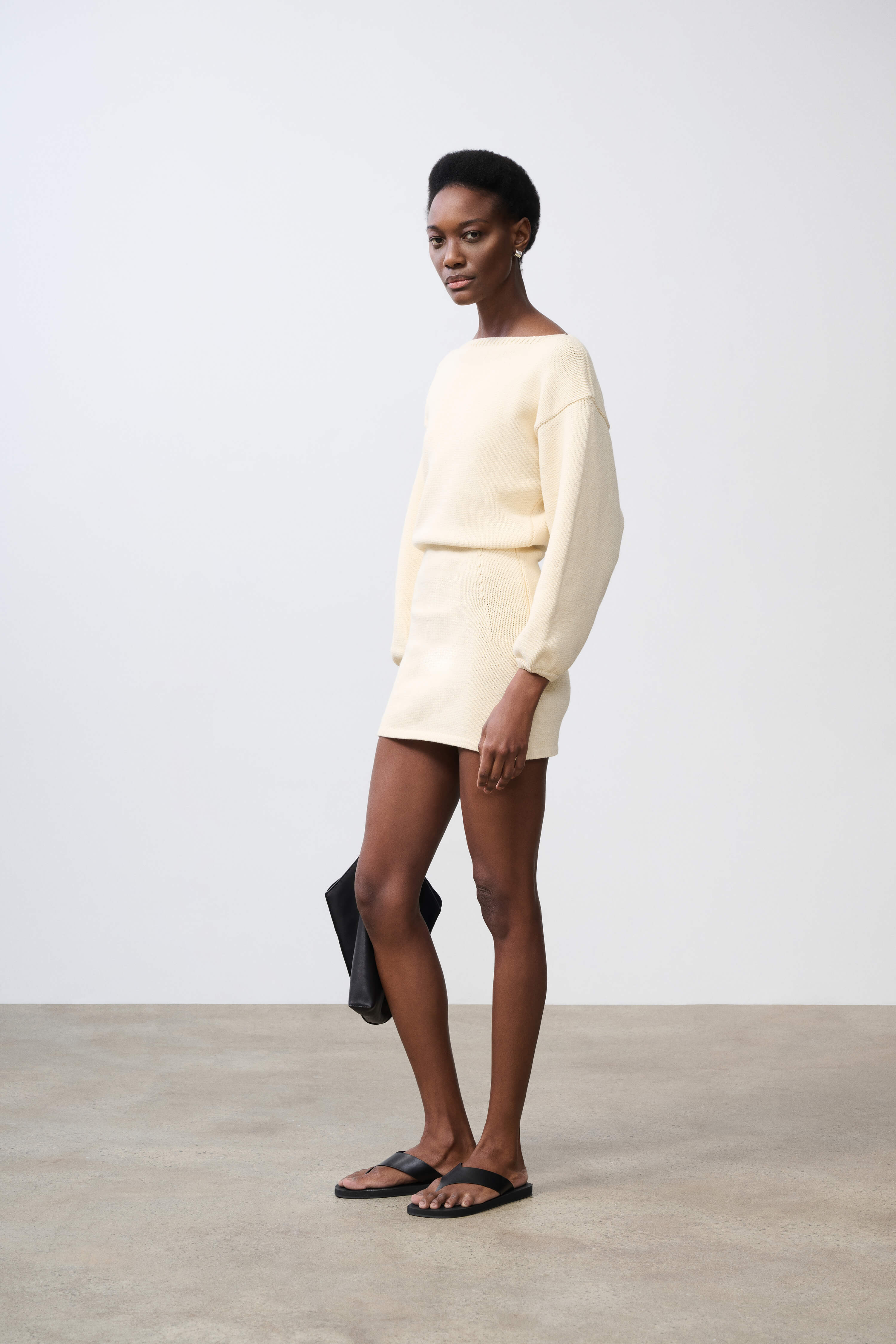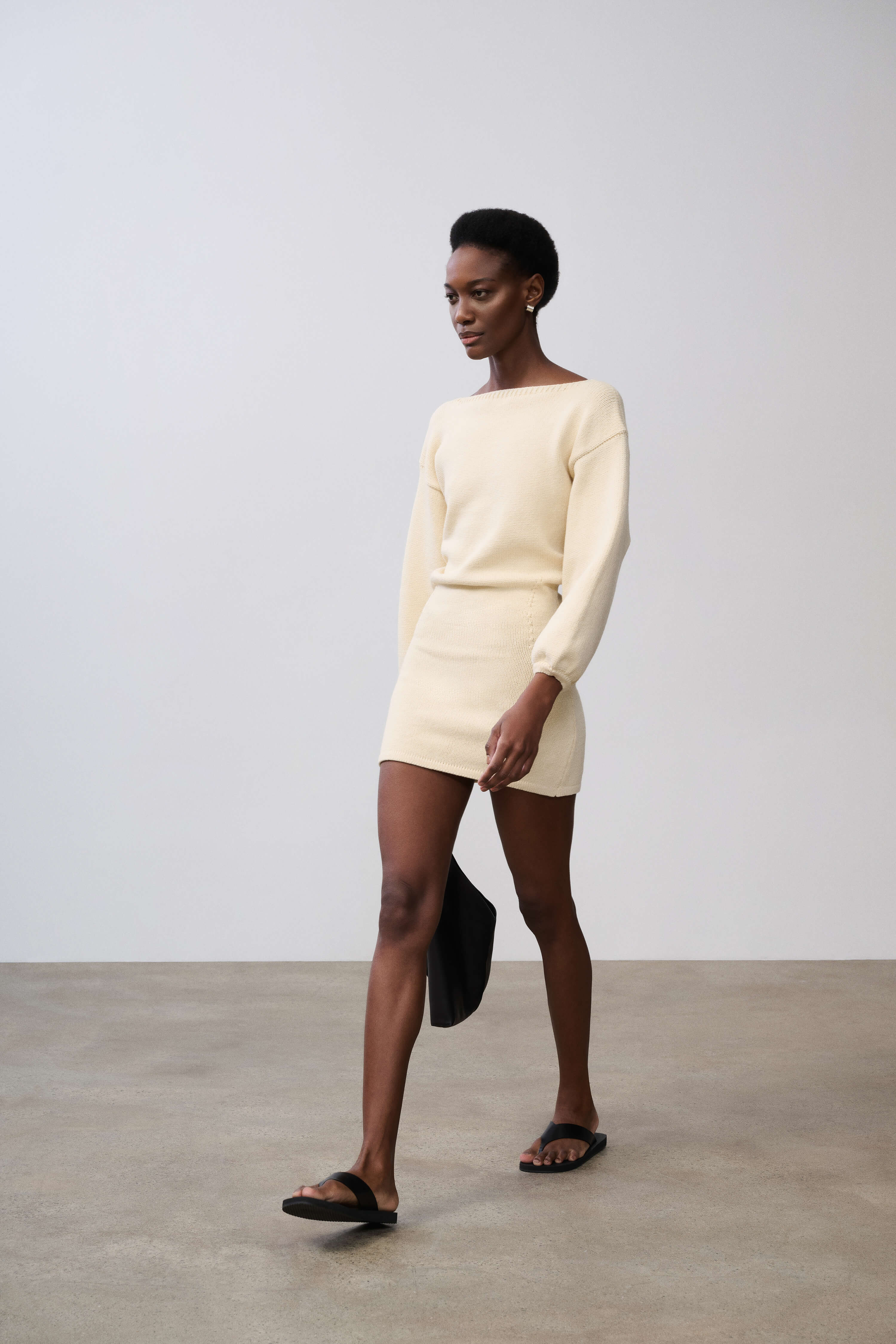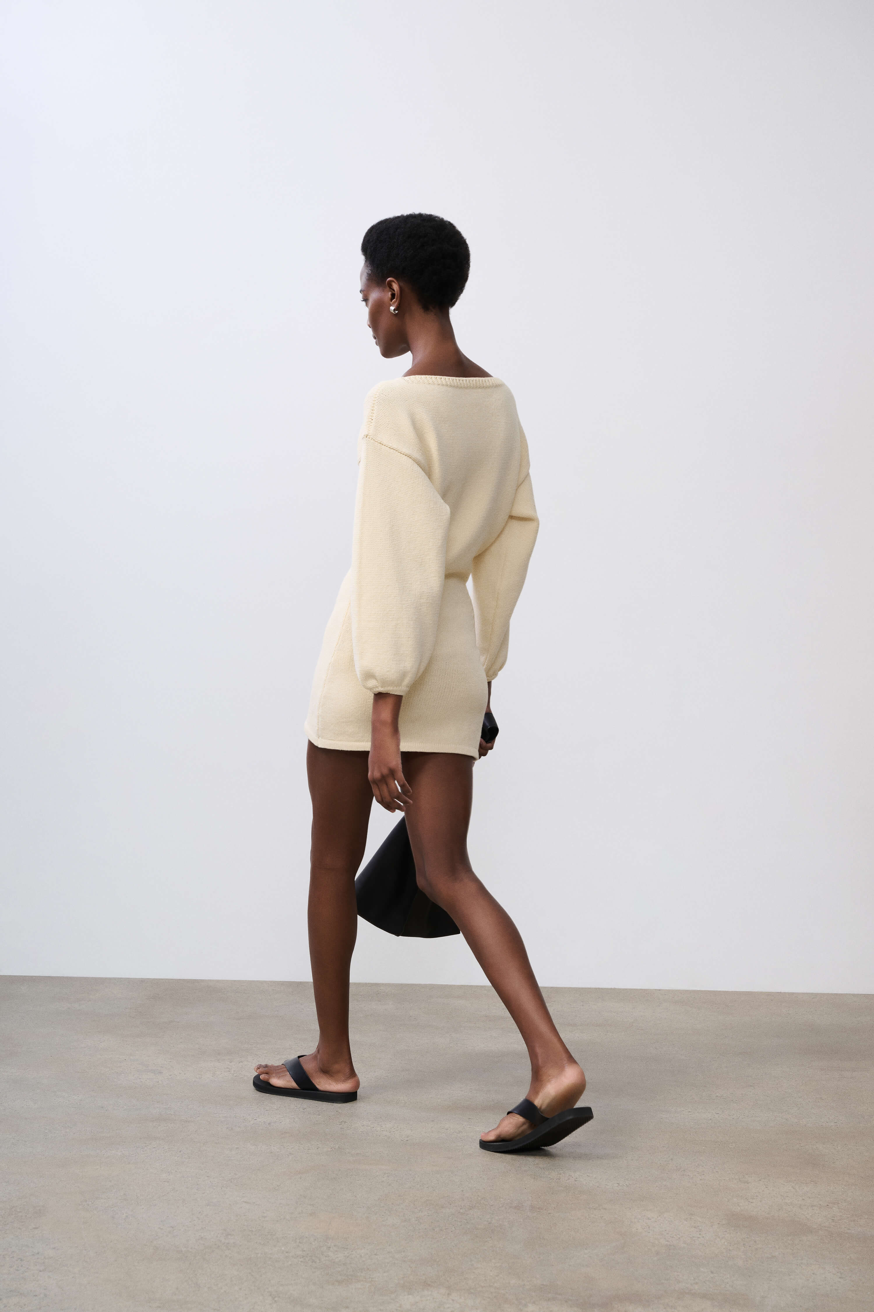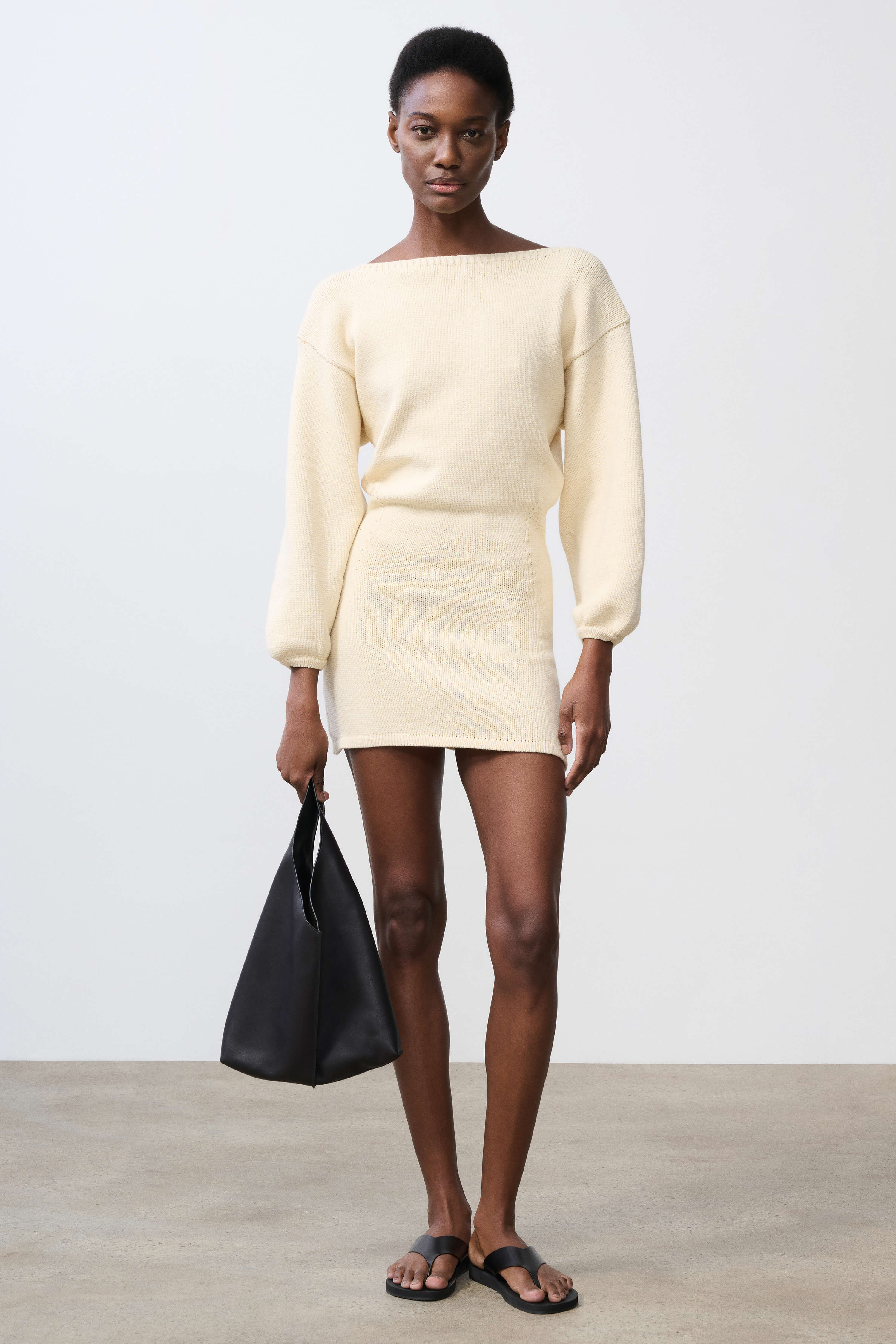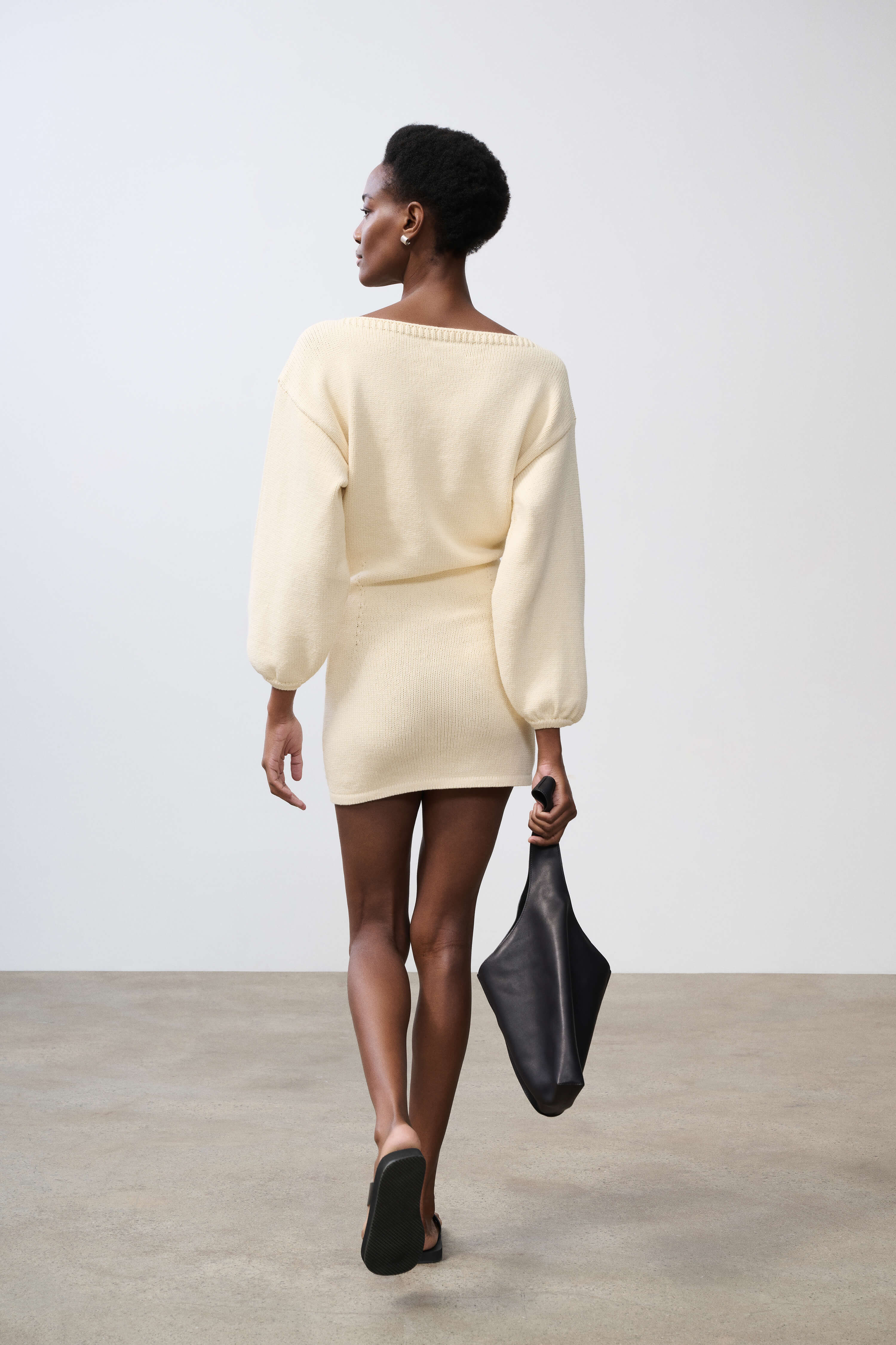 Knit boatneck mini dress with 3/4" balloon sleeve.