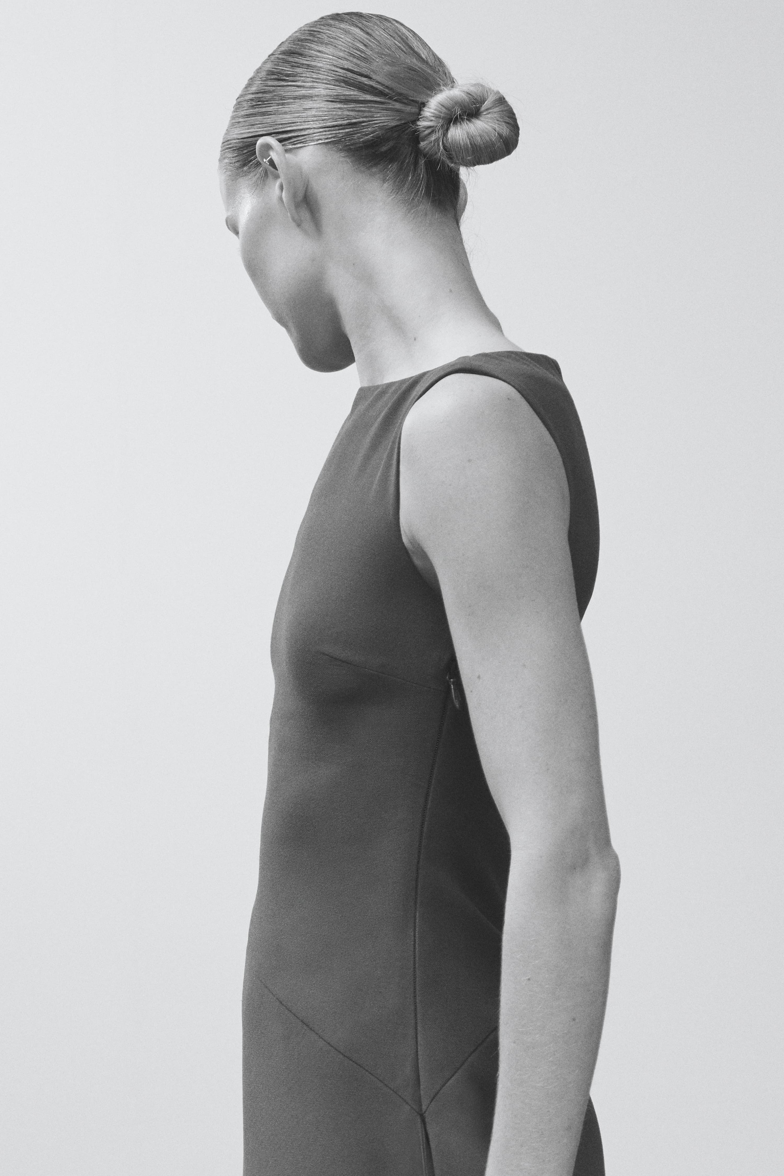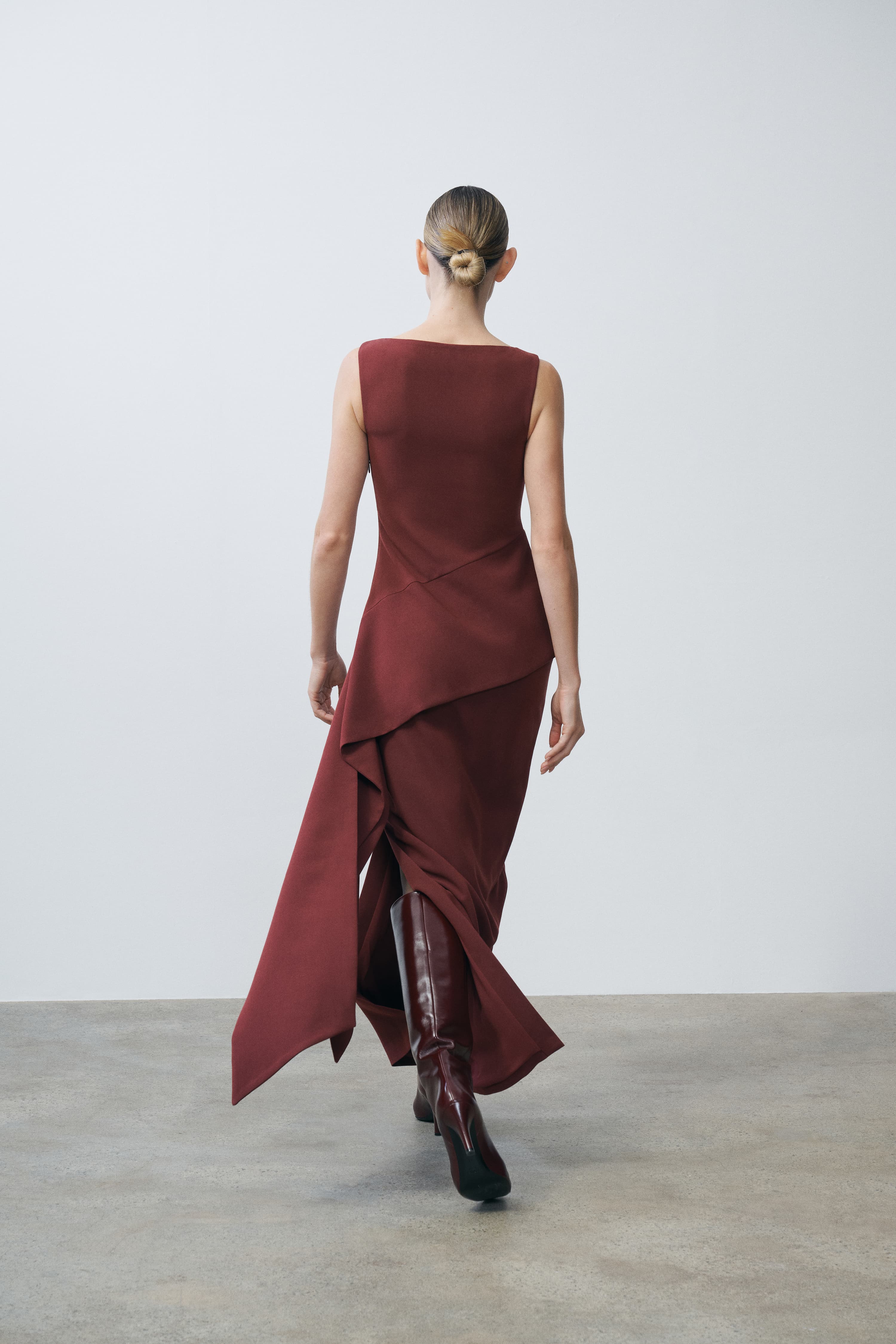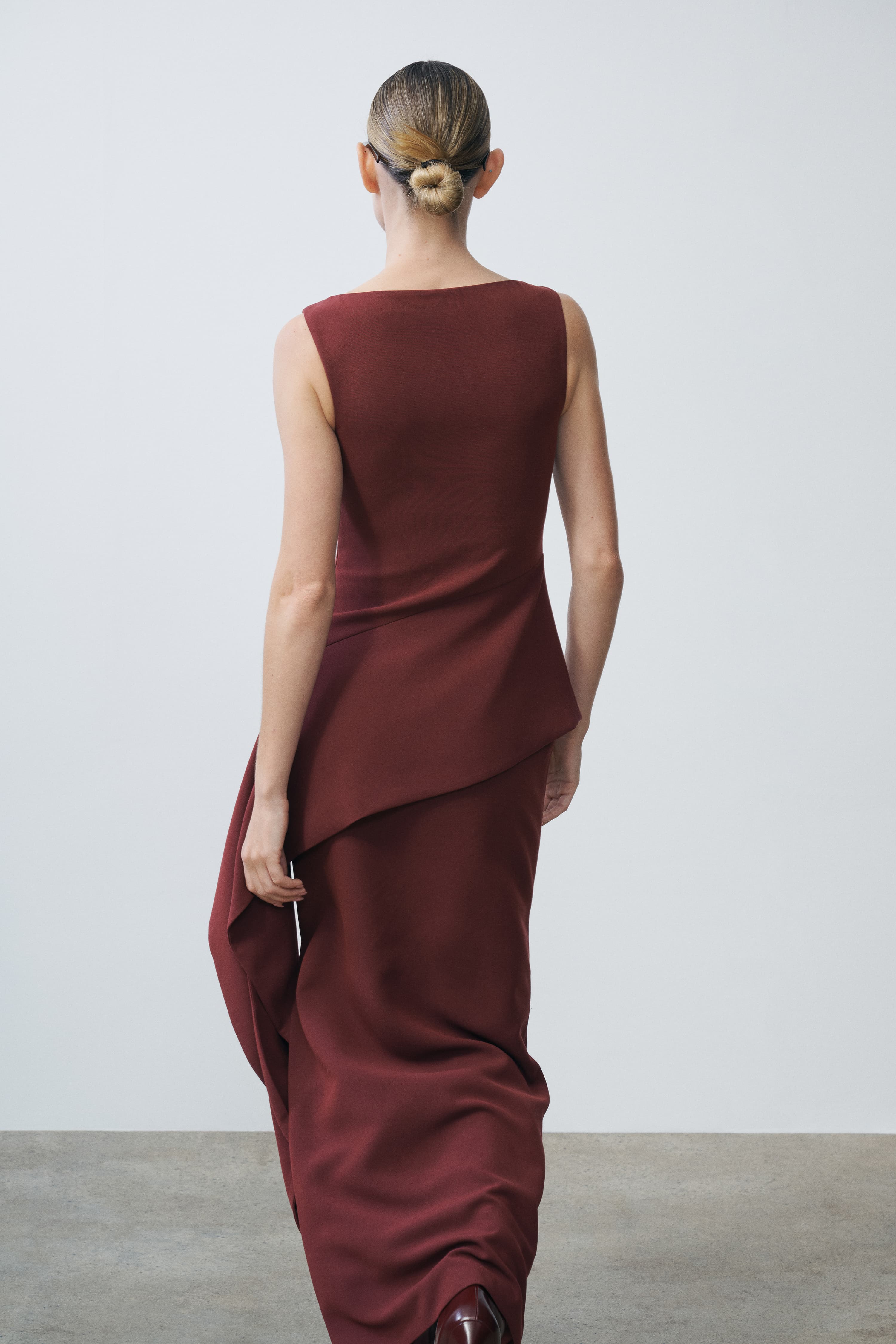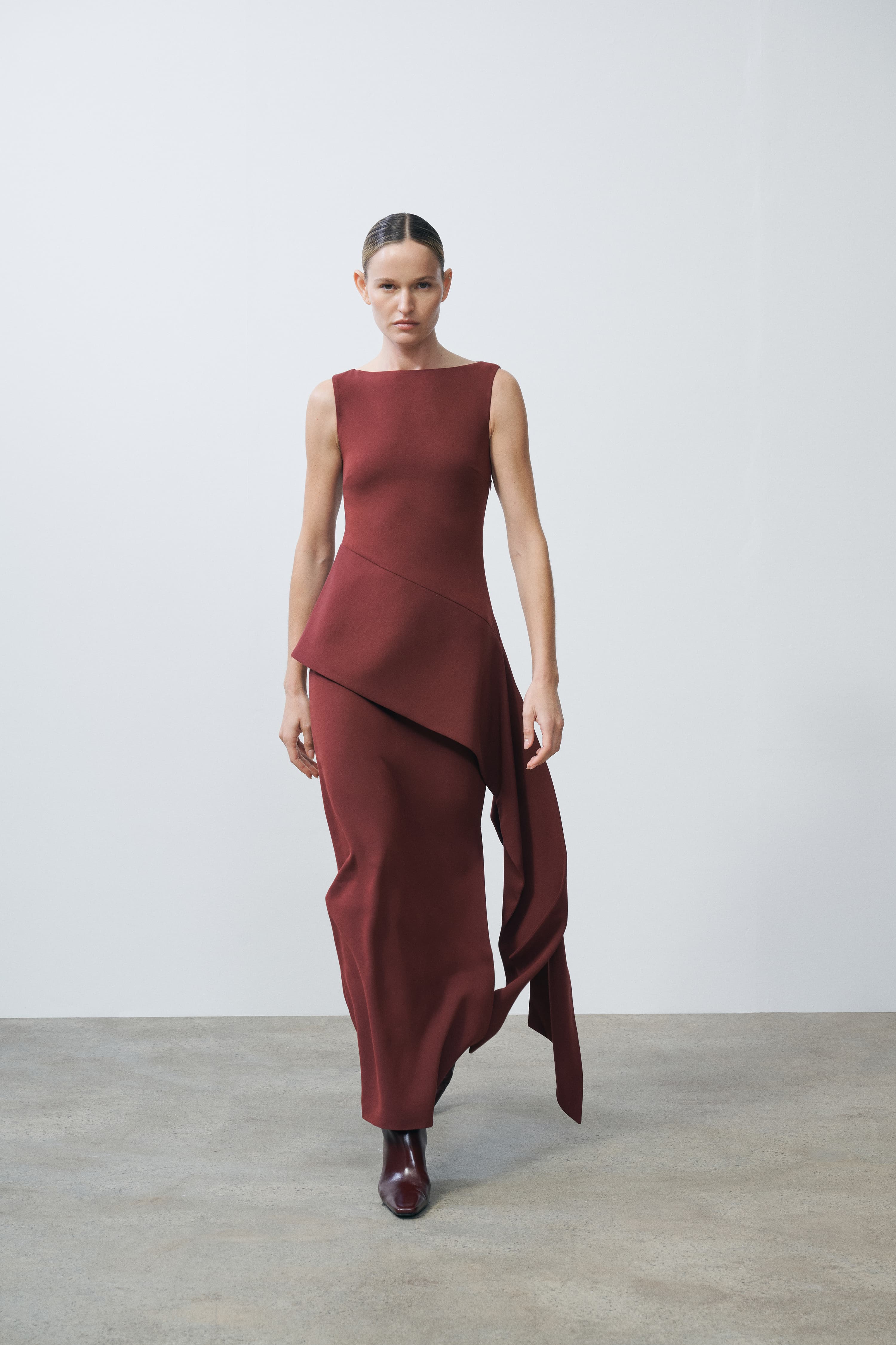 A sleeveless gown with a sculpted bodice and asymmetric draped overlay. The structured design creates dynamic movement through layered panels.