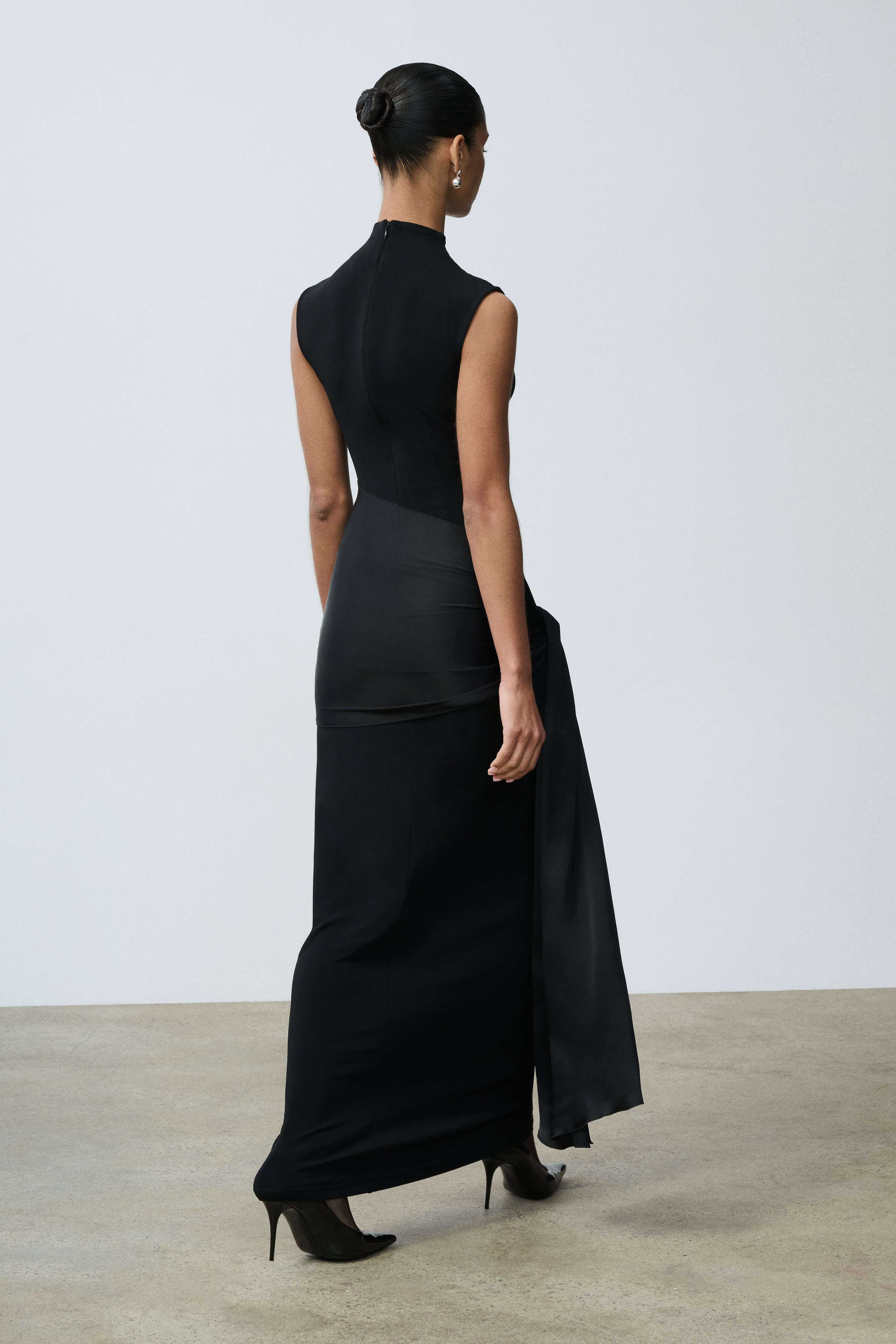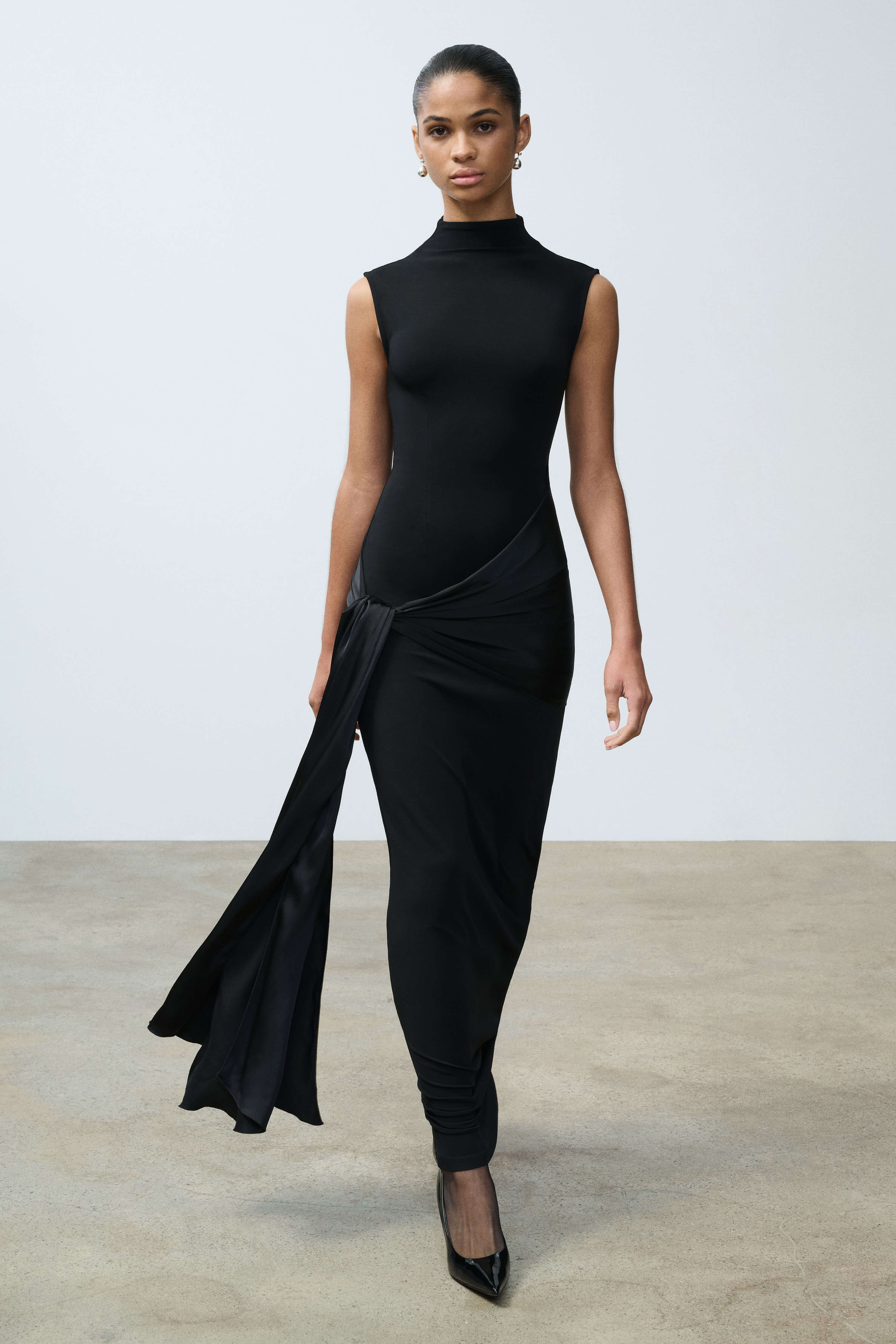 A premium italian midweight high twist matte crepe jersey with soft stretch, elegant drape, and a refined textured surface. The waist drape is in silky, high-shine stretch viscose satin with fluid drape and comfortable give.